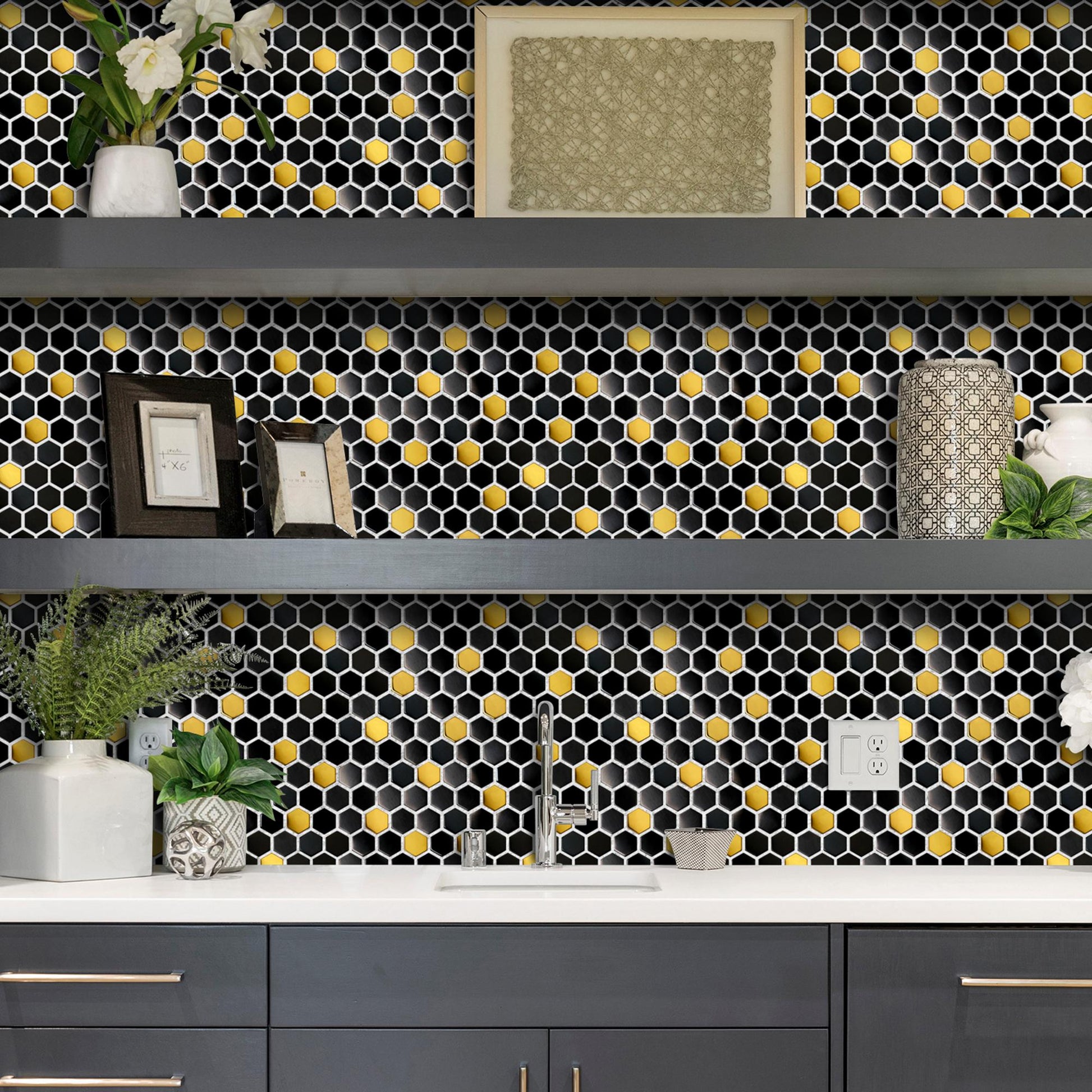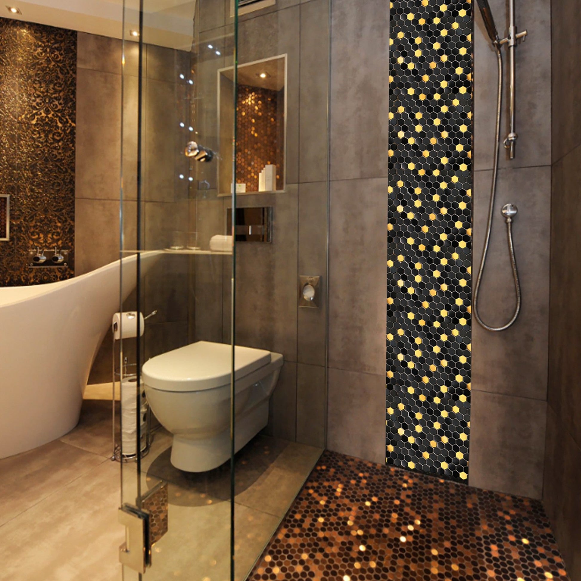Black and Gold Backsplash Wall Tiles Hexagon Mosaic Shower Floor Tile Kitchen Bathroom Tile(Pack of 5)
